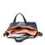 Sac porté main et bandoulière. Bandoulière en cuir réglable et amovible (longueur max. 105 cm). Détails : empiècement en refente de cuir façon «tricot» ou cuir façon «grains caviar». Trois compartiments dont deux avec une fermeture zip et un compartiment central avec fermeture pression aimantée. Intérieur : une poche zippée, deux poches kangourous et un porte-cartes. Peut contenir des documents de taille A4. Cuir de vachette véritable. Doublure coton. Dimensions : H 25,5 x L 35 x P 15 cm.